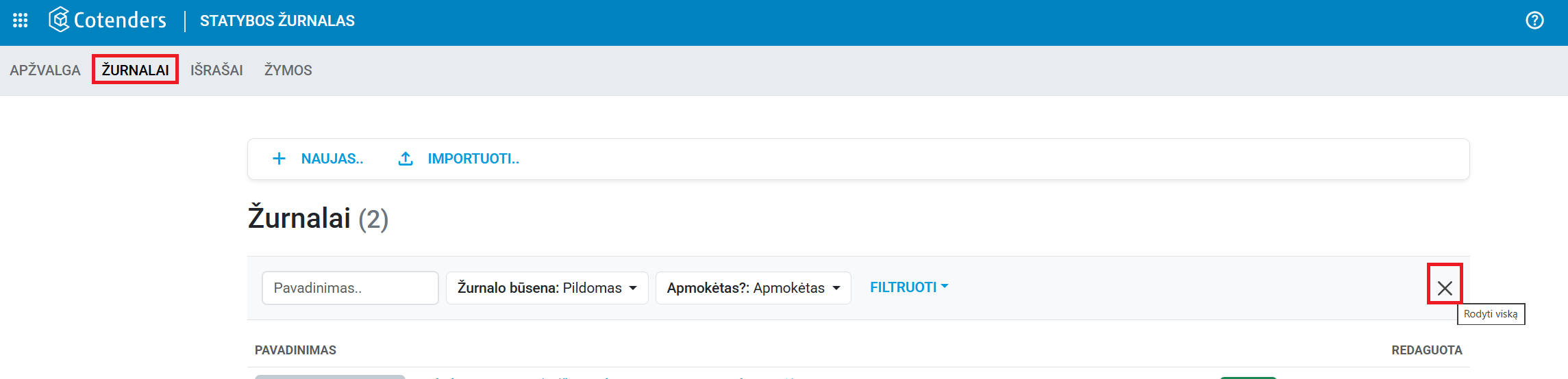 Jeigu apžvalgos lange nėra žurnalo, jį rasite skiltyje Žurnalai, čia rodomi visi žurnalai (neapmokėti, uždaryti, suarchyvuoti). Norint matyti visus žurnalus reikia išvalyti visus paieškos filtrus, paspaudus dešinėje esantį X. Žurnalą galima surasti paieškoje pagal reikiamus kriterijus pavadinimą, žurnalo ar apmokėjimo būseną.